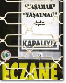 | 16 Ocak Kapalı eczaneler camlarına, Yaşamak ve Yaşatmak İçin Kapalıyız yazılı afişler astı. Nöbetçi eczaneler ise acil olanlar dışındaki ilaçları satmıyorlar. Hiçbir hastanın mağdur edilmeyeceğini ifade eden nöbetçi eczacılar, eczanelerde bulunan ıtriyat ve parfümeri malzemelerini de satmıyorlar. Kepenk kapatan eczaneler ise tek tek belirleniyor. | |||