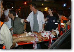 | 9 Eylül 2003 İlk patlama Tel Avivin yakınlarındaki askerlerin kullandığı bir otobüs durağında, Kudüsteki patlama ise kentin batı kesimindeki bir kafenin yakınlarında meydana geldi. İntihar saldırılarının ardından İsrail ordusu da misilleme olarak, Batı Şerianın kuzeyindeki Cenin ve Tulkarim mülteci kamplarına girdi. İkinci intifadanın başlamasından bu yana son 3 yıl içinde intihar saldırılarında ölenlerin sayısı 289a ulaştı. Saldırıları Hamas üstlendi. |